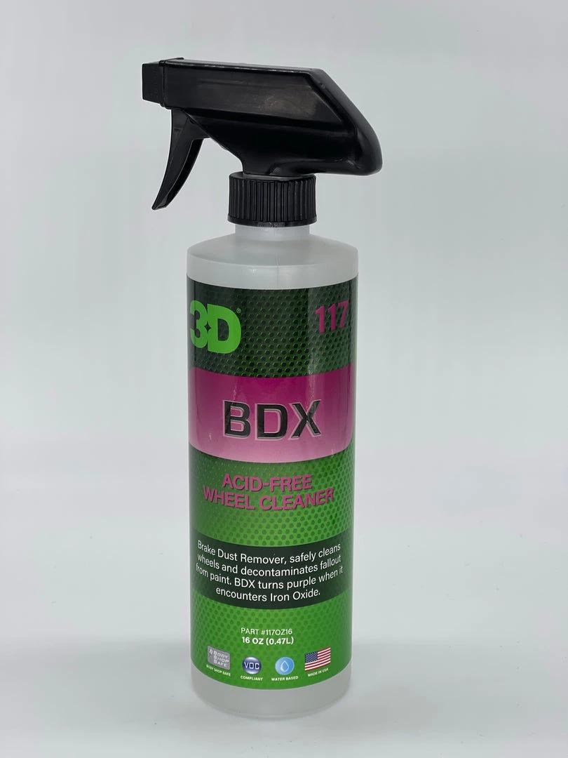 BDX (Brake Dust Remover) will completely remove iron particles and fallout from automotive paint and wheels. This is the fastest, easiest way to clean almost any wheel. BDX is a simple spray formula that instantly turns purple when it comes in contact with iron partials. BDX is acid free, Ph balanced and safely cleans and removes rust stains on wheels and decontaminated fallout from paint that can replace the use of harsh chemicals such as acid. BDX is VOC complaint, Green and Biodegradable.