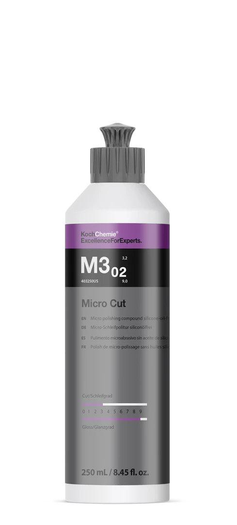 Micro Cut M3.02 is the latest generation machine micro-polish for the permanent removal of streaks, holograms, fine scratches and sanding marks to P3000 grain size on all paint systems (including scratch-resistant). Through the use of highly specialised, extremely homogenous abrasive bodies, a brilliant permanent high gloss finish is created under extreme light conditions even on dark and similarly sensitive shades. Holograms and fine scratches are eliminated mechanically and not, which is often the case, covered over. Micro Cut M3.02 is extremely economical, easy to polish and removable without leaving traces.