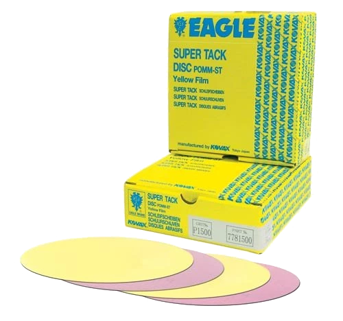 Long lasting high performance Yellow-Film discs cut extremely fast and uniform. Designed for use in topcoat sanding to remove excess orange peel, over-runs, and dust nibs. Can also be used for light scuff sanding before painting. SUPER-TACK system provides cooler sanding and the convenience of easy on and off from disc pad. Recommended using with Cushion Pad (Part no. 04631). SUPER-TACK= Velour backing